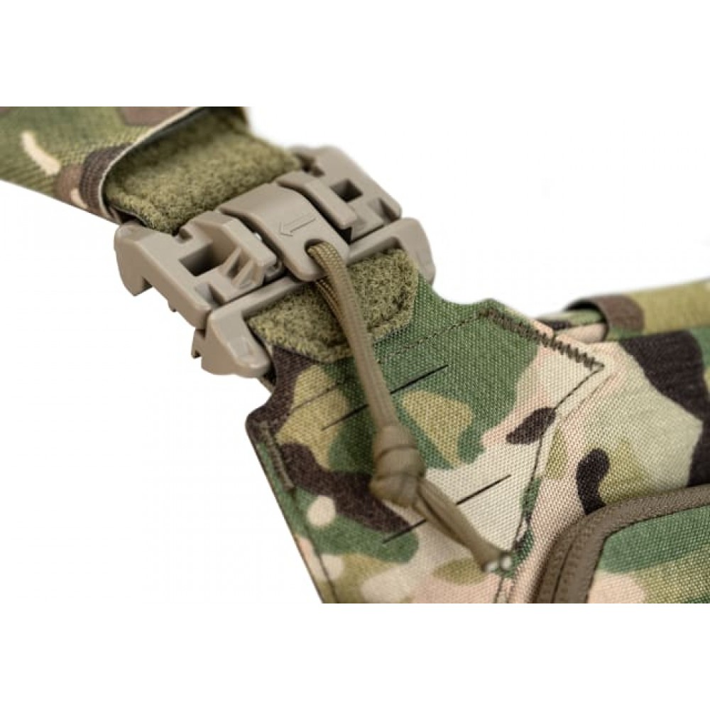 's construction as a base and overall form is very similar to the Operator and Raider. However due to the vest purpose concept some utility differences are highlighted: integrated admin pocket on the front and a snag-free, low-profile rear panel. The PALS Front Flap provides standard amount of space(3 rifle mag) for desired pouches. Flap is attached to the plate carrier with detachable 25mm buckles (hidden underneath the admin pocket), yet it might be fixed without them, permanently for less exposed profile. PALS Front Flap once detached, can be used with our 4 Point Harnesses in the role of a small Chest Rig.